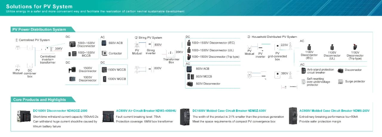 集中式光伏系统直流部分达1000~1500V,配备多种电压等级隔离开关与塑壳断路器;交流部分为690V,含空气断路器与接触器。组串式光伏系统直流1500V,交流800V,配置符合不同标准的隔离开关、空气断路器及塑壳断路器等。