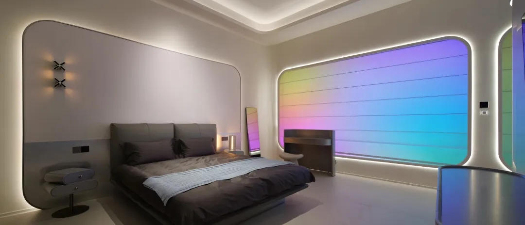 卧室的“安睡场景”模式,灯光渐熄、空调自动调节至睡眠模式,尽显科技温情。